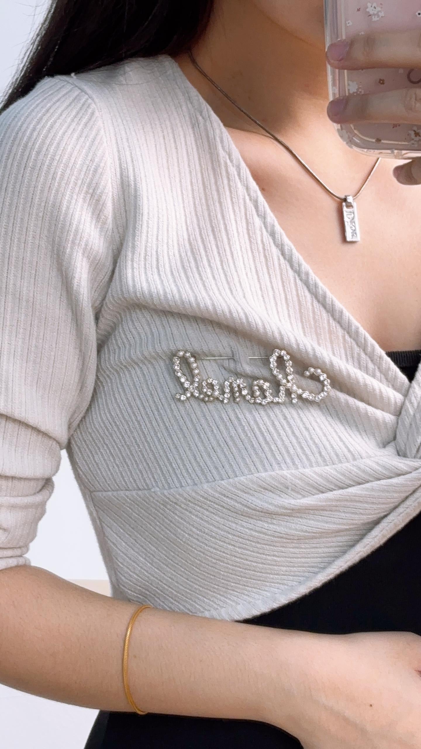 Chanel Light Gold Script Pearl Diamante Brooch